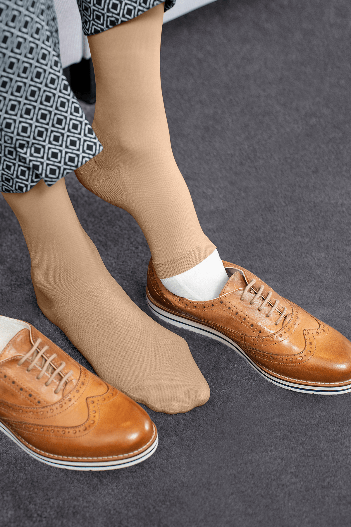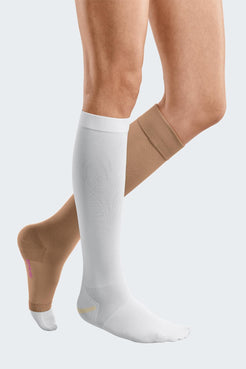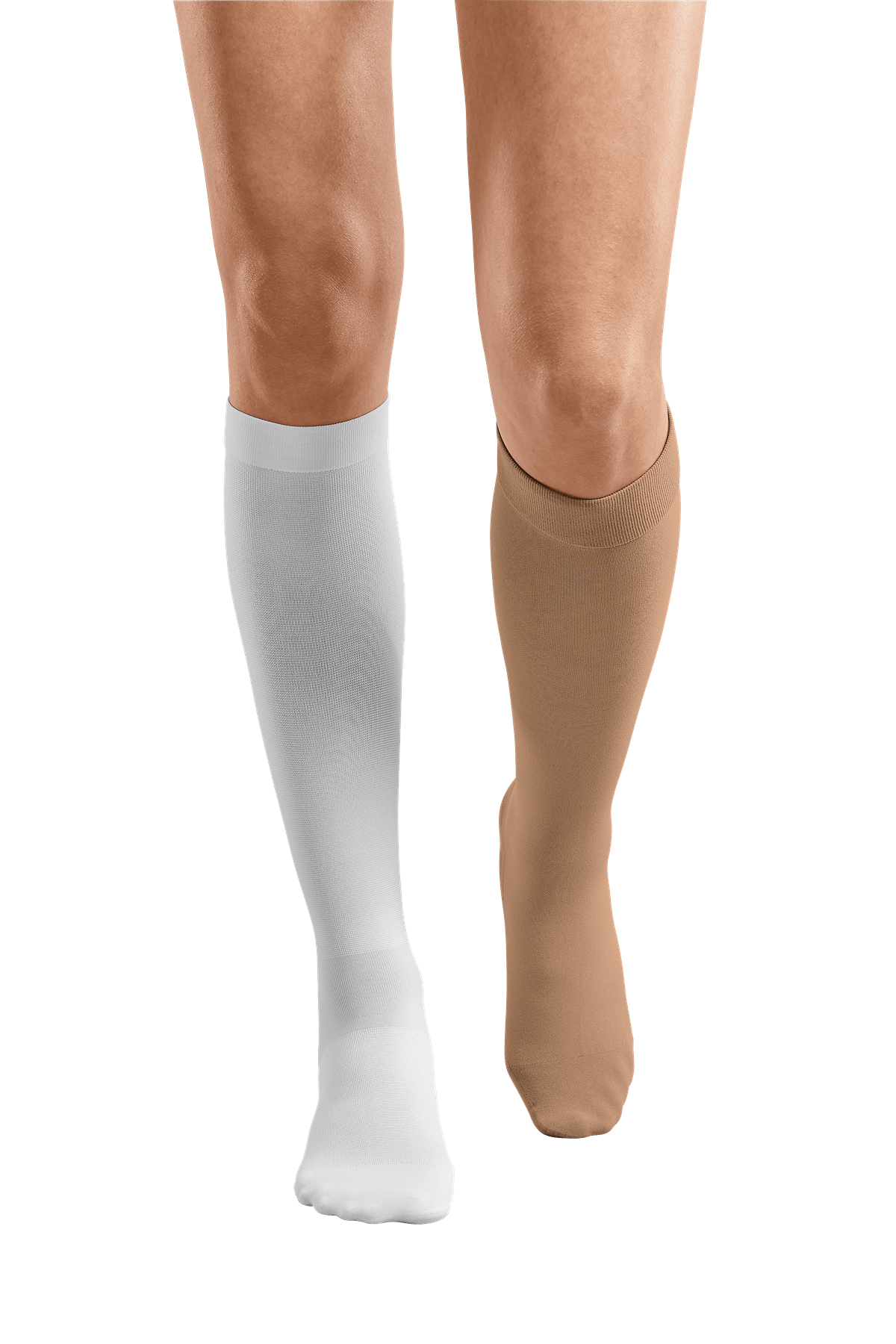 De binnenkous is wit en de buitenkous heeft een natuurlijke huidkleur. De anatomische pasvorm sluit nauw aan rond voet, enkel en kuit en biedt een gelijkmatige, betrouwbare compressieverdeling. De speciale hielconstructie zorgt voor een goede positionering, terwijl de zachte materialen het draagcomfort vergroten.